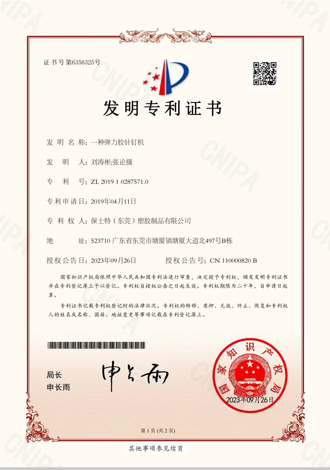 • 專利證書